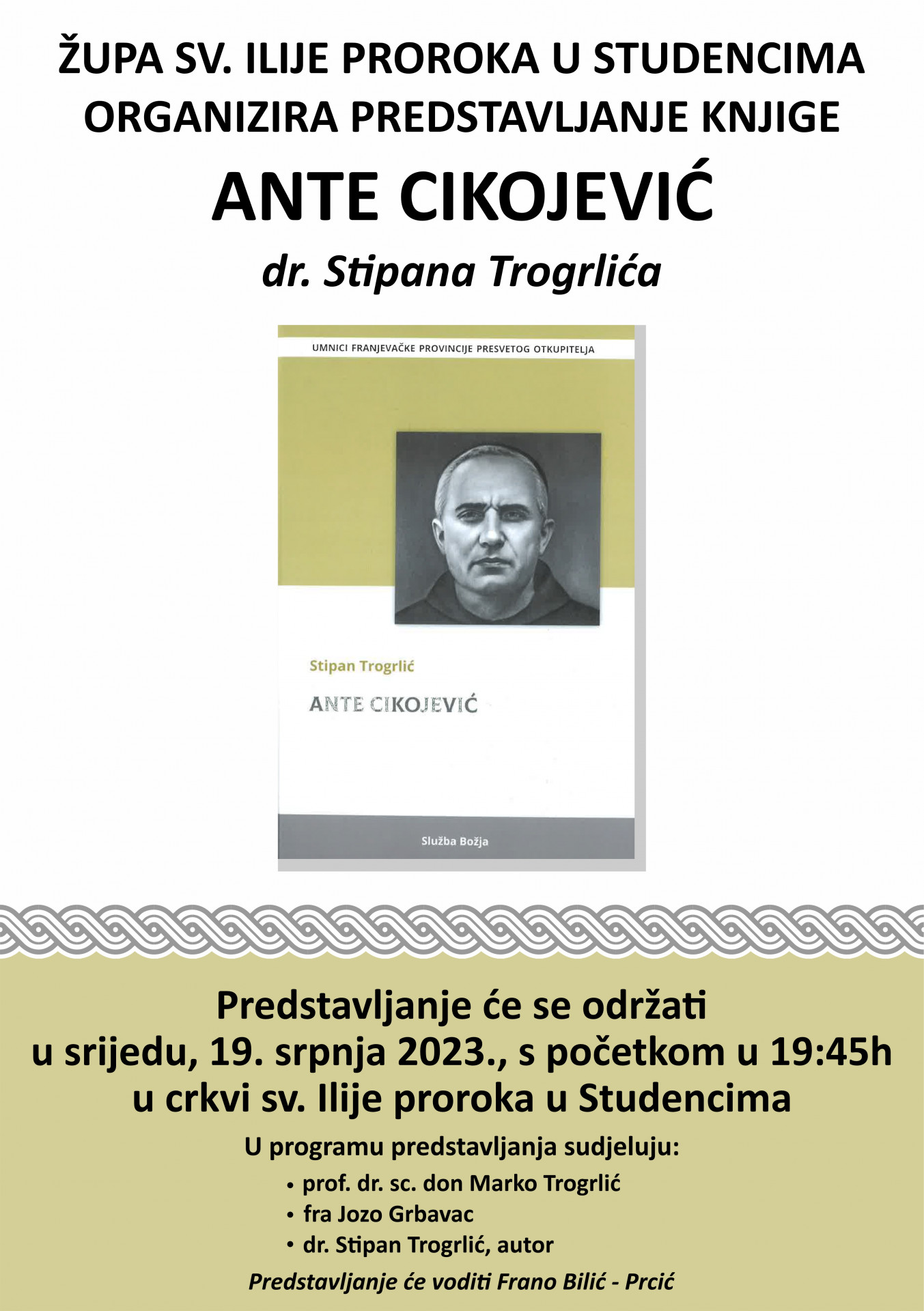 Župa sv. Ilija proroka u Studencima organizira predstavljanje knjige “Ante Cikojević” dr. Stipana Trogrlića 19. srpnja s početkom u 19:45.