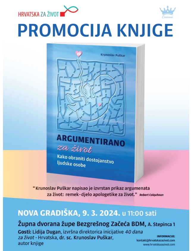 Predstavljanje knjige „Argumentirano za život. Kako obraniti dostojanstvo ljudske osobe“ održat će se u subotu, 9. ožujka 2024. u 11 sati u dvorani Župe Bezgrješnog začeća Blažene Djevice Marije u Novoj Gradiški. Knjigu će predstaviti autor dr. sc. Krunoslav Puškar.