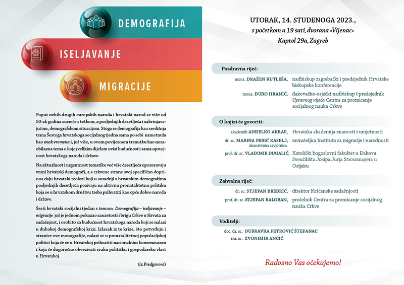 Predstavljanje knjige „Demografija – iseljavanje – migracije. Šesti hrvatski socijalni tjedan, Zagreb, 22. i 23. listopada 2021.“ bit će održano u utorak 14. studenoga 2023., u dvorani „Vijenac“ u Zagrebu (Kaptol 29 A), s početkom u 19 sati.