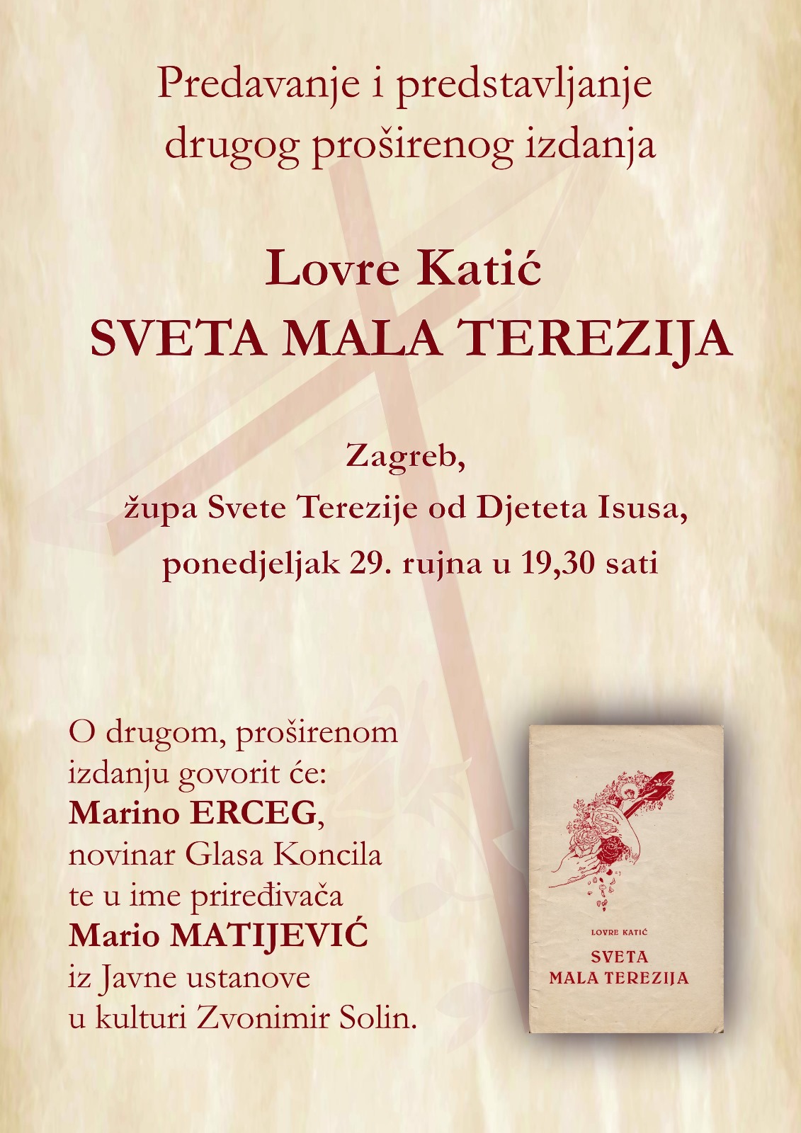 Drugo i prošireno izdanje knjige don Lovre Katića „Sveta Mala Terezija“ bit će predstavljeno u ponedjeljak 29. rujna u 19.30 u Župi sv. Male Terezije u Zagrebu (Miramarska cesta 92). O knjizi će govoriti novinar Glasa Koncila Marino Erceg te uime priređivača Mario Matijević iz Javne ustanove u kulturi „Zvonimir“ iz Solina.