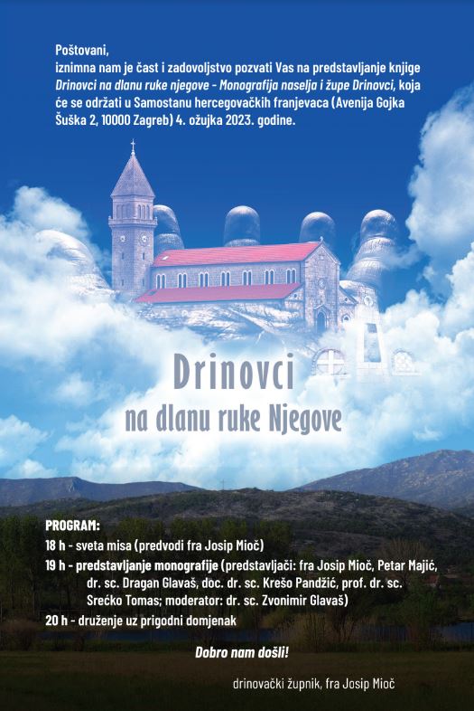 Predstavljanje knjige „Drinovci na dlan ruke Njegove – Monografija naselja i župa Drinovci” održat će se u samostanu hercegovačkih franjevaca u Zagrebu (Avenija Gojka Šuška 2, 10000 Zagreb) u subotu, 4. ožujka.