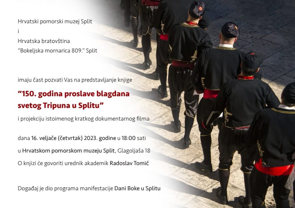 Publikacijom čiji je urednik akademik Radoslav Tomić, koji će ju i predstaviti, zabilježen je tijek zbivanja u riječi i slici, od svečane akademije u Hrvatskom pomorskom muzeju do Kola na Peristilu i misnog slavlja u katedrali sv. Dujma. Knjiga sadrži tekstove svih govornika na svečanoj akademiji te brojne fotografije koje prikazuju ne samo nedavnu svečanost nego i ljude i događaje iz bokeljske prošlosti. Prije predstavljanja publikacije prikazat će se kratki dokumentarni film „150 godina proslave blagdana sv. Tripuna u Splitu“ koji je nastajao usporedo s publikacijom te koji je režirao Miki Nopling.