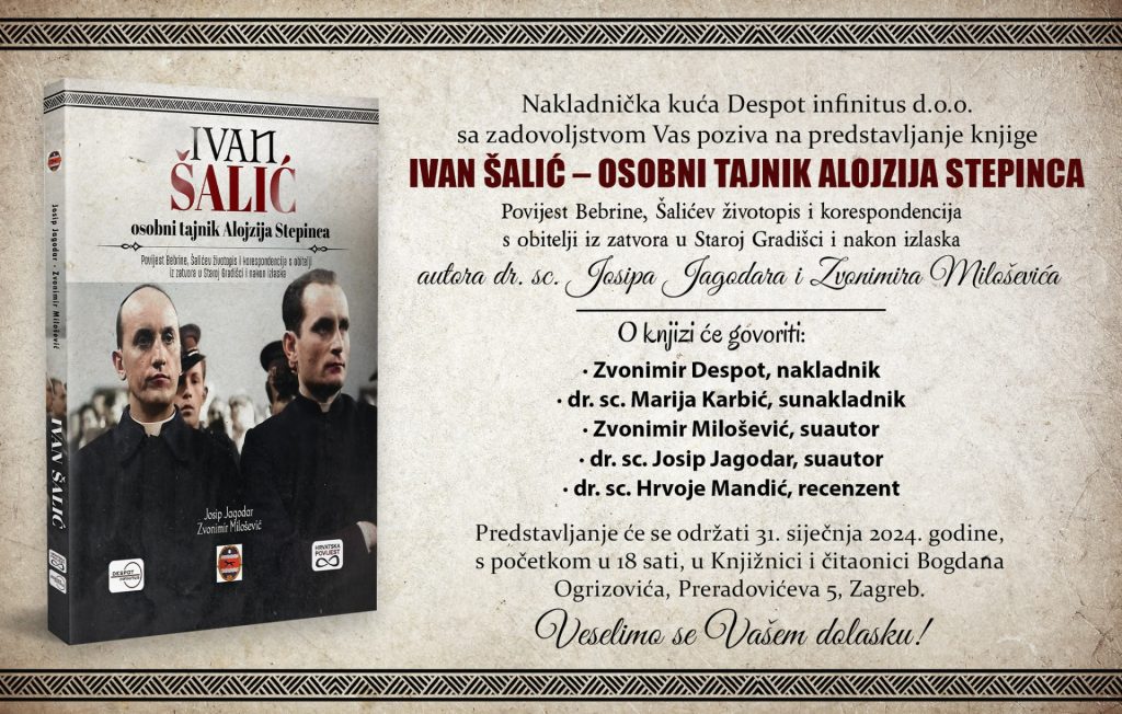 Knjiga „Ivan Šalić – osobni tajnik Alojzija Stepinca“ autora dr. sc. Josipa Jagodara i Zvonimira Miloševića bit će predstavljena u srijedu, 31. siječnja 2024. u Knjižnici i čitaonici Bogdana Ogrizovića u Zagrebu u 18 sati.