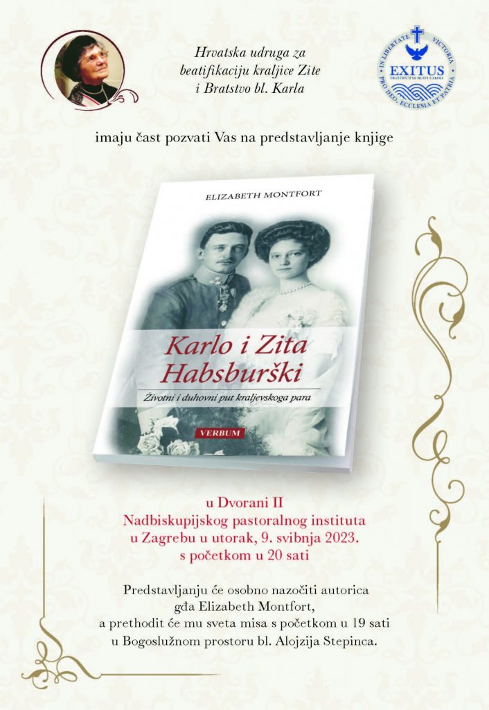 Hrvatska udruga za beatifikaciju kraljice Zite i Bratstvo bl. Karla organiziraju u utorak 9. svibnja u Dvorani II Nadbiskupijskog pastoralnog instituta u Zagrebu u 20 sati predstavljanje knjige „Karlo i Zita Habsburški: Životni i duhovni put kraljevskoga para“. Predstavljanju knjige prethodit će misno slavlje u 19 sati u Bogoslužnom prostoru bl. Alojzija Stepinca.