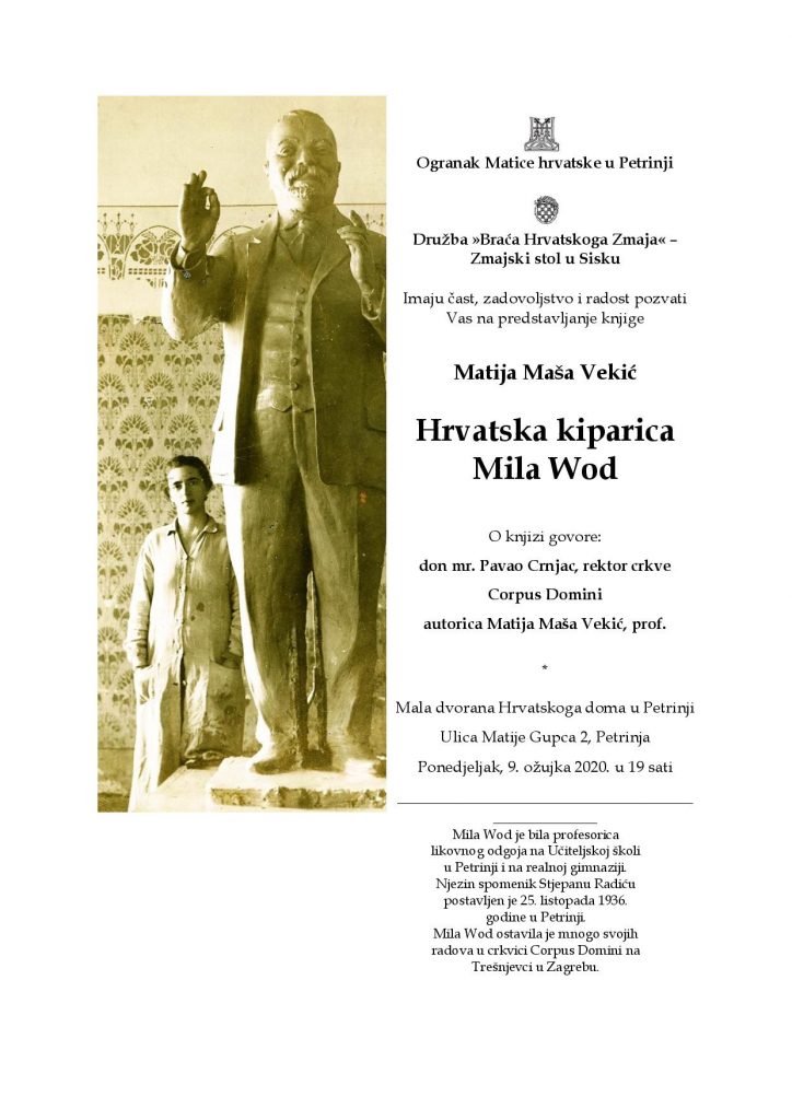 U Maloj dvorani Hrvatskog doma u Petrinji u ponedjeljak 9. ožujka s početkom u 19 sati u organizaciji ogranka Matice hrvatske u Petrinji i Družbe “Braća Hrvatskoga Zmaja” – Zmajski stol u Sisku bit će upriličeno predstavljanje knjige autorice prof. Matije Maše Vekić “Mila Wod”.