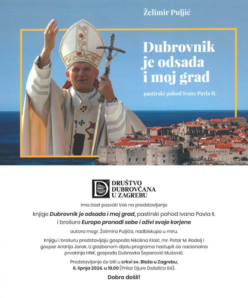Knjiga Dubrovnik je odsada i moj grad − pastirski pohod Ivana Pavla II. i brošura Europo pronađi sebe i oživi svoje korijene autora nadbiskupa Želimira Puljića bit će predstavljene u četvrtak 6. lipnja 2024. u 19 sati u crkvi sv. Blaža u Zagrebu.