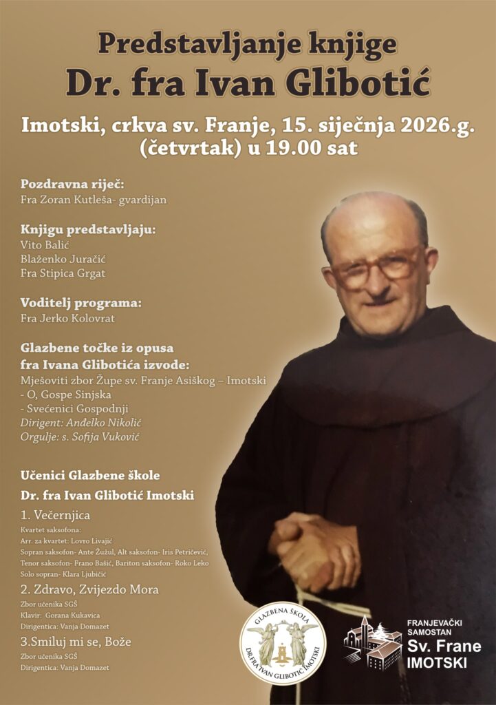 Predstavljanje knjige o dr. fra Ivanu Glibotiću održat će se u četvrtak 15. siječnja nakon večernje mise u 19 sati u crkvi sv. Franje u Imotskom. Fra Ivan je u Imotskom bio gvardijan i župnik, a posljednje dane ovozemaljskog života proveo je u samostanu u Imotskom gdje je i preminuo. Glazbene točke izvest će Mješoviti župni zbor te učenici Glazbene škole u Imotskom koja nosi ime fra Ivana Glibotića.