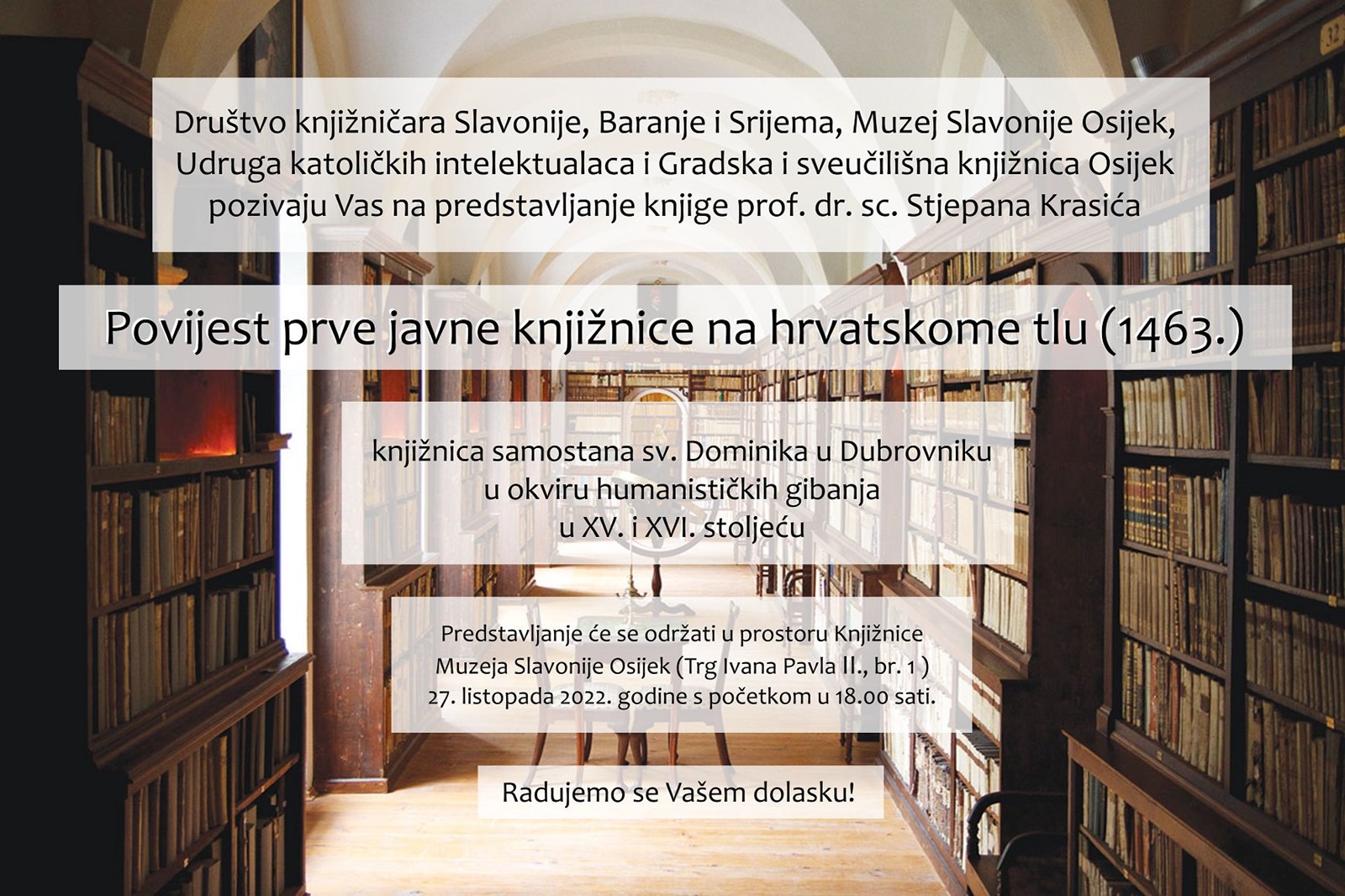 Društvo knjižničara Slavonije, Baranje i Srijema, Muzej Slavonije Osijek, Udruga katoličkih intelektualaca i Gradska i sveučilišna knjižnica Osijek organiziraju u četvrtak 27. listopada predstavljanje knjige prof. dr. sc. Stjepana Krasića „Povijest prve javne knjižnice na hrvatskome tlu (1463.), knjižnica samostana sv. Dominika u Dubrovniku u okviru humanističkih gibanja u XV. i XVI. stoljeću“.