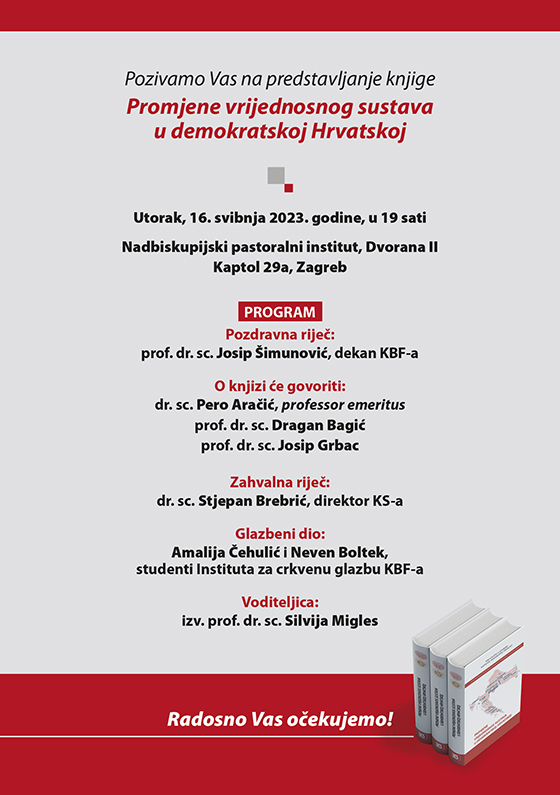 Predstavljanje knjige „Promjene vrijednosnog sustava u demokratskoj Hrvatskoj” u izdanju Kršćanske sadašnjosti i Katoličkog bogoslovnog fakulteta Sveučilišta u Zagrebu održat će se 16. svibnja u Nadbiskupijskom pastoralnom institutu u Zagrebu s početkom u 19 sati.