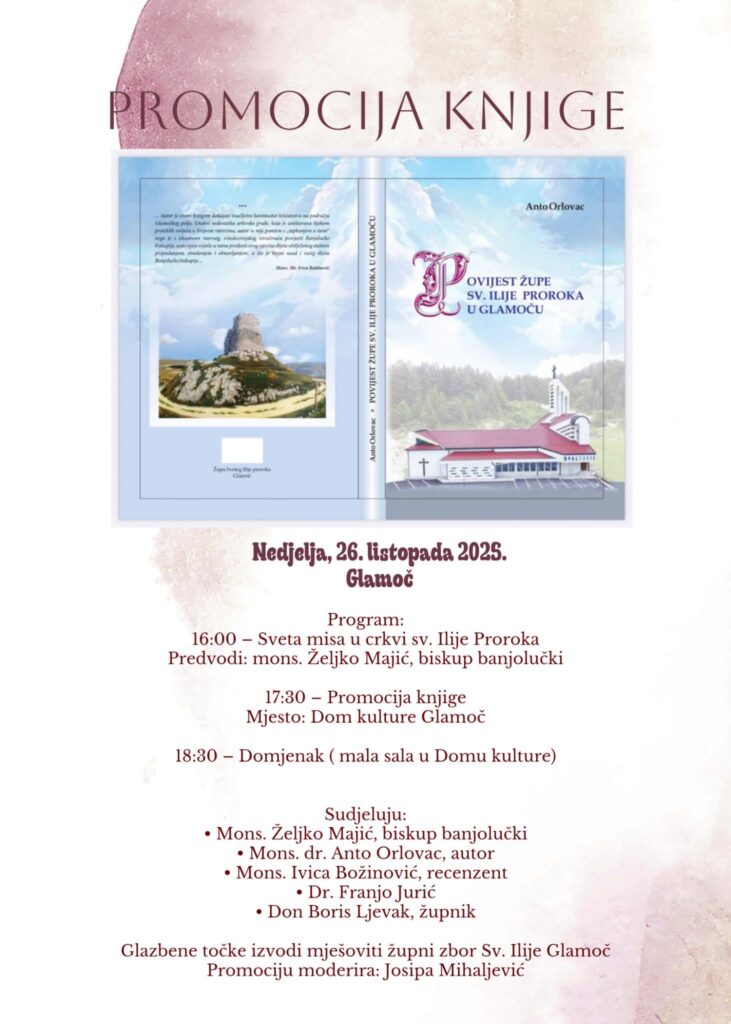 Promocija knjige „Povijest župe sv. Ilije proroka u Glamoču“ autora mons. Ante Orlovca održat će se u nedjelju, 26. listopada u Glamoču. Program započinje svetom misom u 16 sati u crkvi sv. Ilije proroka, koju će predvoditi banjolučki biskup Željko Majić. Promocija knjige slijedi u 17:30 u Domu kulture Glamoč, a potom i domjenak.