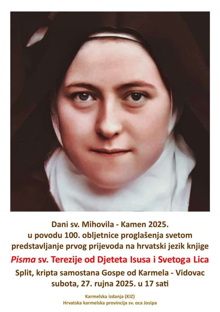 U sklopu „Dana sv. Mihovila – Kamen 2025.“, povodom 100. obljetnice proglašenja svetom Terezije od Djeteta Isusa i Svetoga Lica, crkvene naučiteljice, Hrvatska karmelska provincija sv. oca Josipa i Karmelska izdanja (KIZ) organiziraju predstavljanje prvog prijevoda na hrvatski jezik knjige „Pisma“ te popularne svetice koja je mnogima poznatija kao „Mala Terezija“. Predstavljanje će se održati u subotu 27. rujna u 17 sati u kripti samostana Gospe od Karmela – Vidovac u Splitu. U toj prigodi sudionici će moći nabaviti tu i druge knjige Karmelskih izdanja na temu Male Terezije, s prigodnim promotivnim popustima.