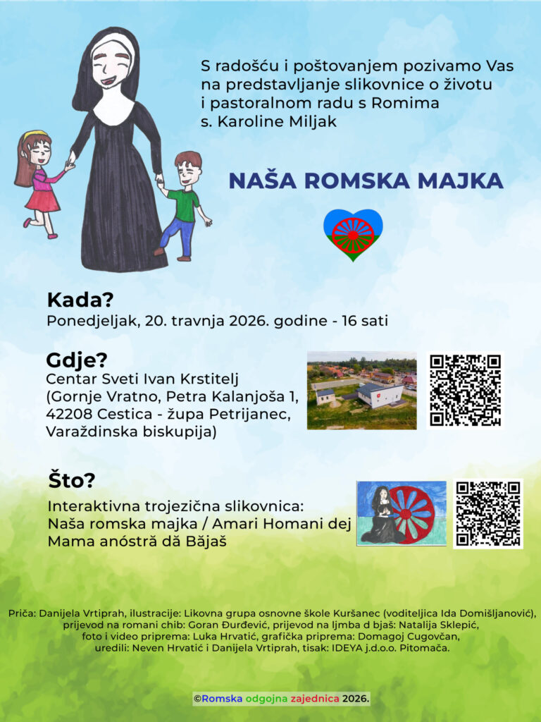 Predstavljanje slikovnice o životu i pastoralnom radu članice Družbe Klanjateljica Krvi Kristove s. Karoline Miljak s Romima „Naša romska majka“ održat će se u ponedjeljak 20. travnja u 16 sati u Centru sv. Ivana Krstitelja u Gornjem Vratnu (Petra Kalanjoša 1).