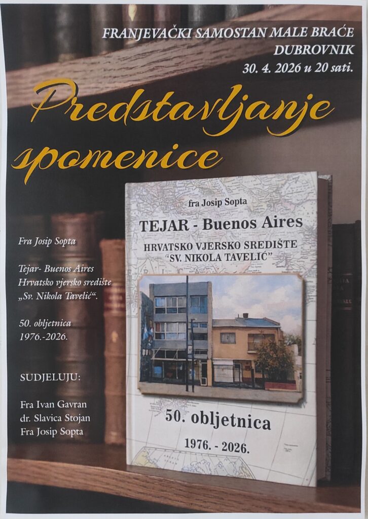 Spomenica pod naslovom „Tejar – Buenos Aires: Hrvatsko vjersko središte ‘Sv. Nikola Tavelić’“, objavljena povodom njegove 50. obljetnice (1976. – 2026.), bit će predstavljena u četvrtak 30. travnja u 20 sati u franjevačkom samostanu Male braće u Dubrovniku.