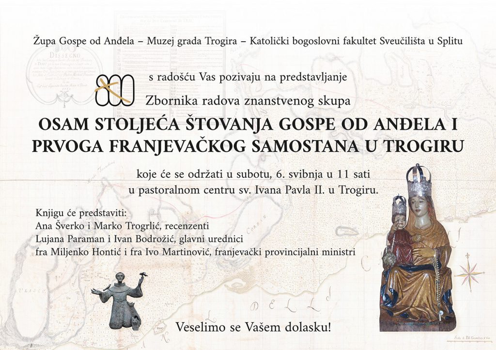 Predstavljanje zbornika radova znanstvenog skupa „Osam stoljeća štovanja Gospe od Anđela i prvoga franjevačkoga samostana u Trogiru“ bit će održano u subotu 6. svibnja 2023. u 11 sati u pastoralnom centru sv. Ivana Pavla II. u Trogiru.