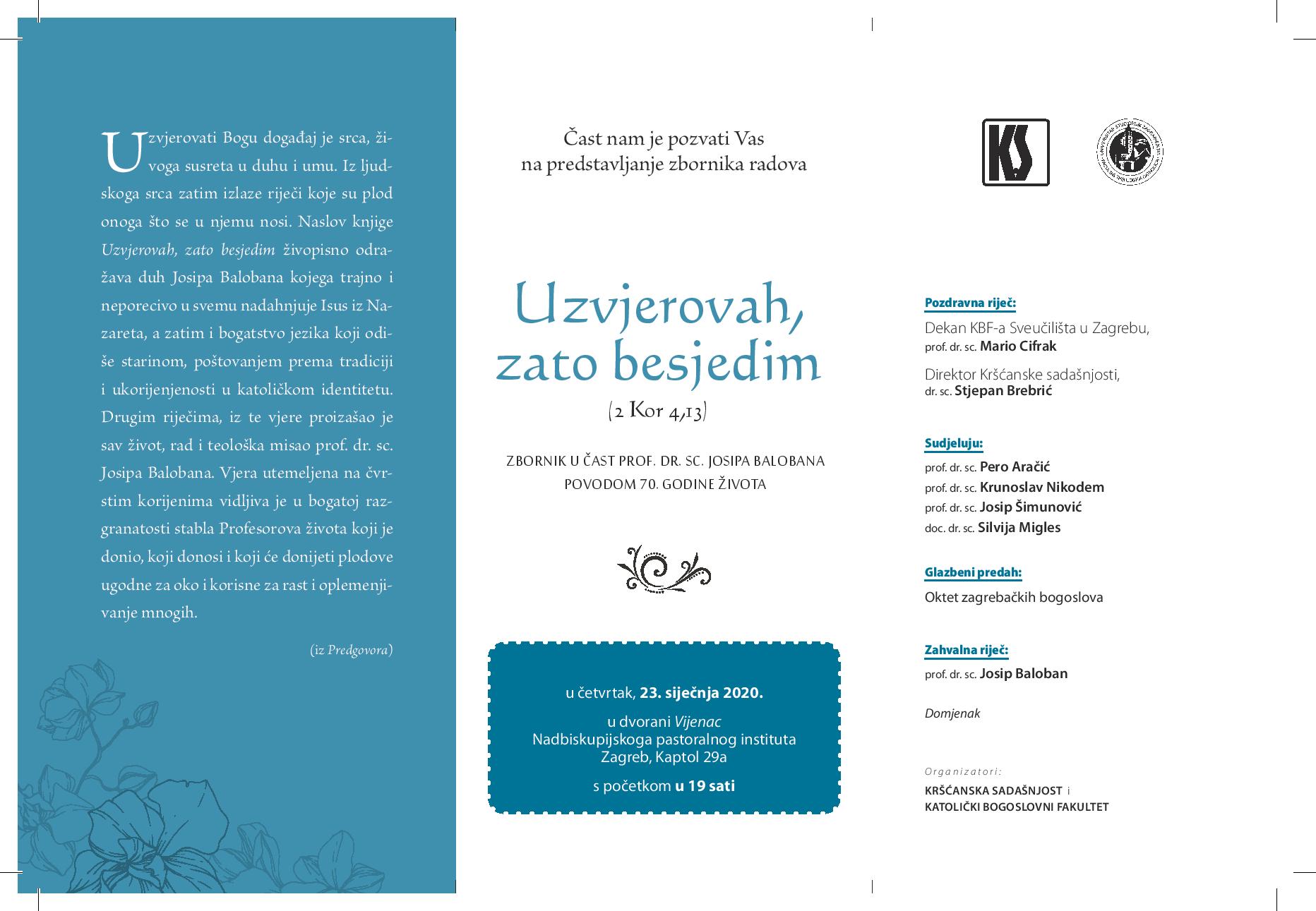 Zbornik radova „Uzvjerovah, zato besjedim (2 Kor 4,13)“ u čast prof. dr. sc. Josipa Balobana u povodu 70. godine života bit će predstavljen u četvrtak 23. siječnja u dvorani Vijenac Nadbiskupijskoga pastoralnog instituta Zagreb, Kaptol 29a, s početkom u 19 sati.