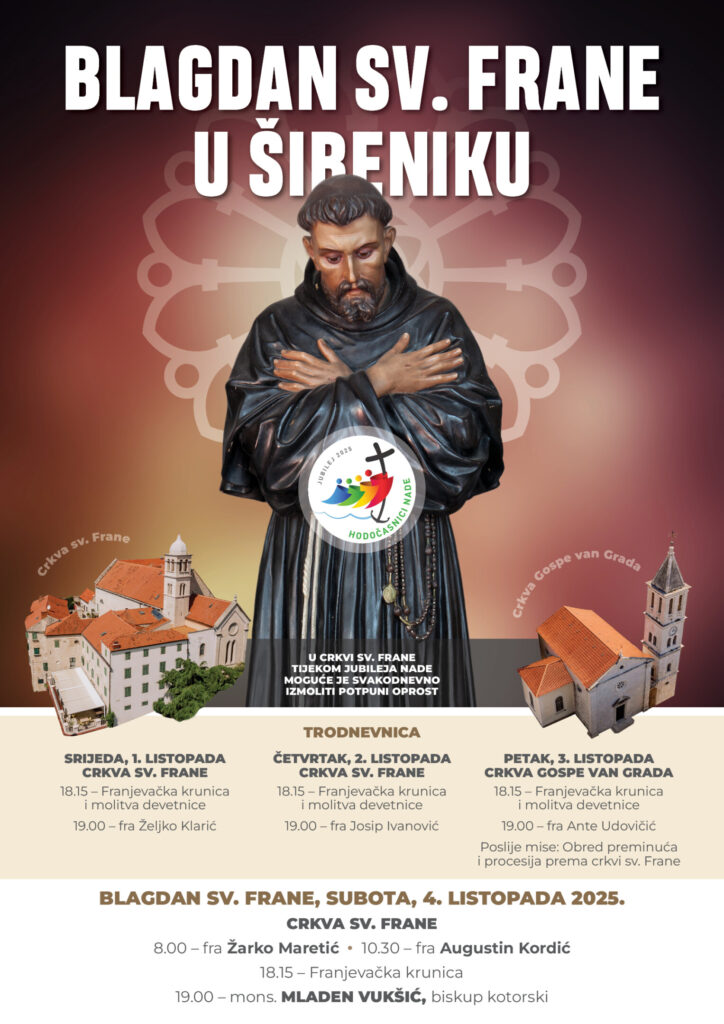 U Hrvatskom nacionalnom svetištu sv. Nikole Tavelića i crkvi sv. Frane u Šibeniku svetkovina sv. Frane proslavit će se u subotu 4. listopada središnjim misnim slavljem u 19 sati koje će predslaviti kotorski biskup Mladen Vukšić. Poslije mise bit će štovanje relikvija sv. Franje. Mise će se toga dana slaviti i u 8 te 10.30.