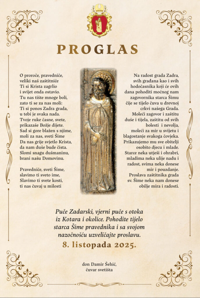 Proglas potiče sve vjernike zadarskog kraja, kao i hodočasnike koji ovih dana žele pohoditi relikviju tijela sv. Šimuna Bogoprimca koja se čuva u drevnoj zadarskoj bazilici, u relikvijaru iz 14. stoljeća.
