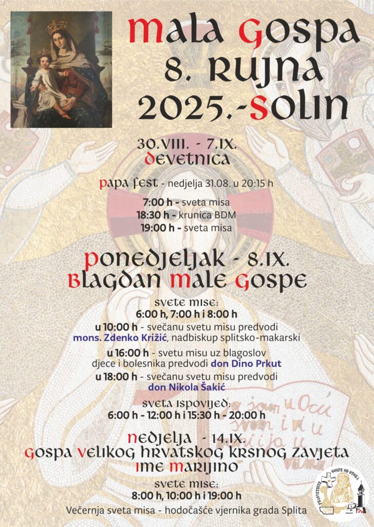 Devetnicom koja počinje u subotu 30. kolovoza i traje do nedjelje 7. rujna, vjernici će se pripraviti za proslavu blagdana Male Gospe, zaštitnice Solina.