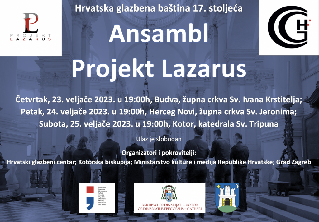 Budva/Herceg Novi/Kotor, (IKA) – Ansambl Projekt Lazarus održat će koncerte pod nazivom „Hrvatska glazbena baština 17. stoljeća“ u Budvi (23. veljače), Herceg Novom (24. veljače) i Kotoru (25. veljače) u 19 sati u povodu 10. obljetnice postojanja ansambla. Na programu će se naći djela najznačajnijih hrvatskih baroknih skladatelja – Ivana Lukačića, Vinka Jelića, Ivana Šibenčanina, Francesca Sponge Uspera i Damjana Nembrija. Koncerti će se održati pod pokroviteljstvom Ministarstva kulture i medija Republike Hrvatske i Grada Zagreba te u organizaciji Kotorske biskupije i Hrvatskoga glazbenog zavoda.