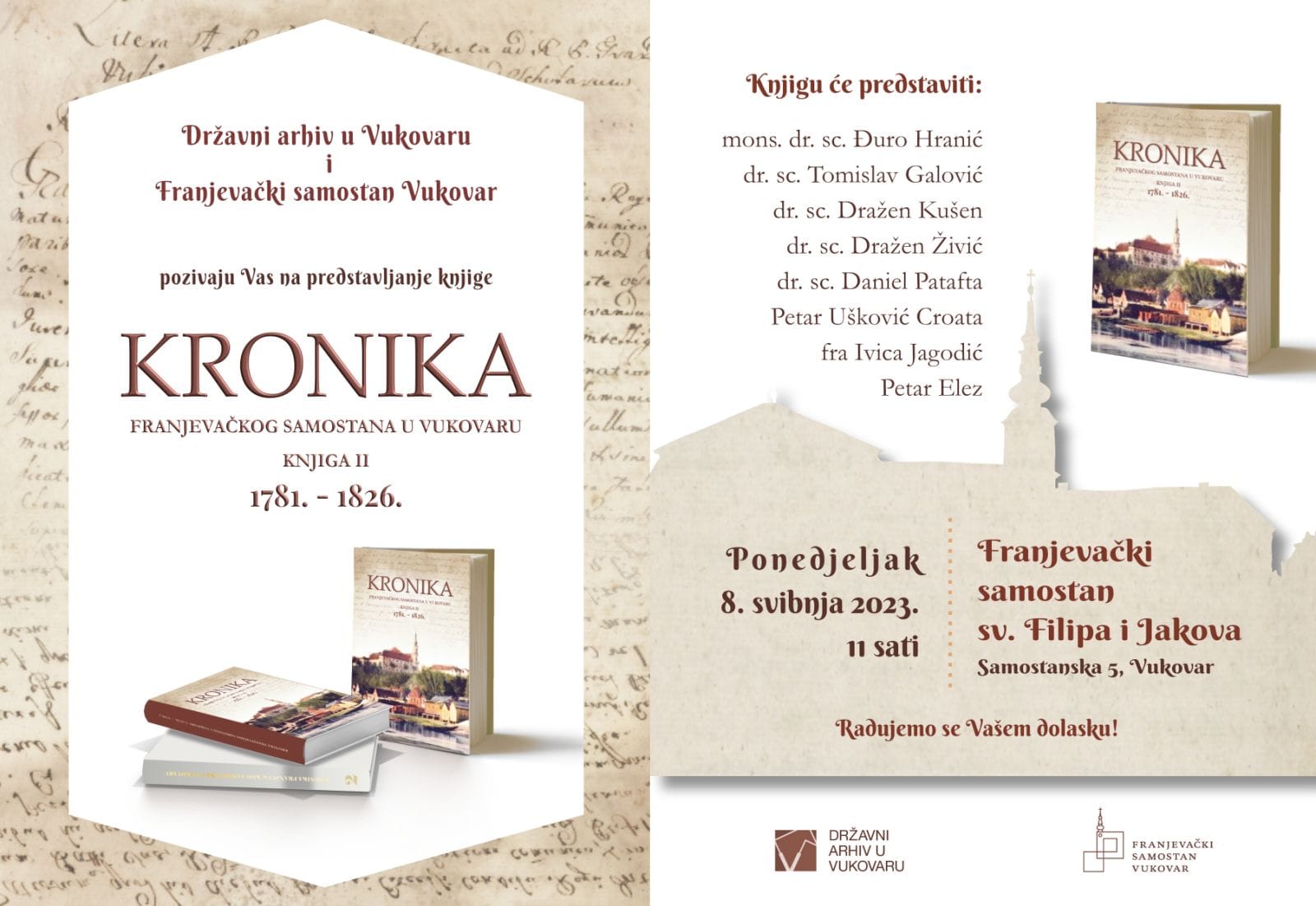 U ponedjeljak 8. svibnja u 11 sati u Franjevačkom samostanu sv. Filipa i Jakova u Vukovaru održat će se promocija druge knjige Kronike franjevačkoga samostana u Vukovaru 1781.-1826.