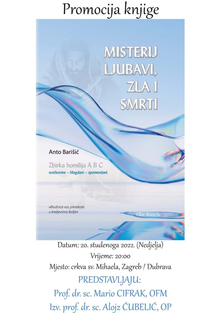 Zbirka homilija za A, B i C godinu pod nazivom „Misterij ljubavi, zla i smrti“, autora dr. sc. Anta Barišića, profesora KBF-a u Zagrebu, biti će predstavljena u zagrebačkoj crkvi Svetog Mihaela u Kapucinskoj ulici u zagrebačkoj Dubravi, u nedjelju 22. studenoga u 20 sati.