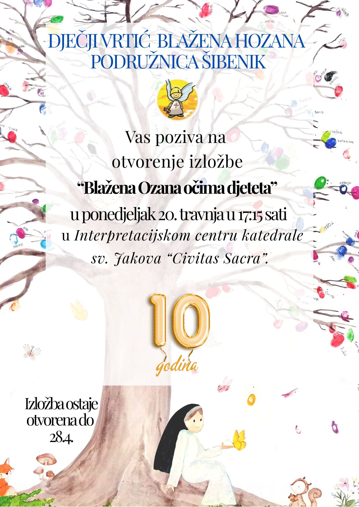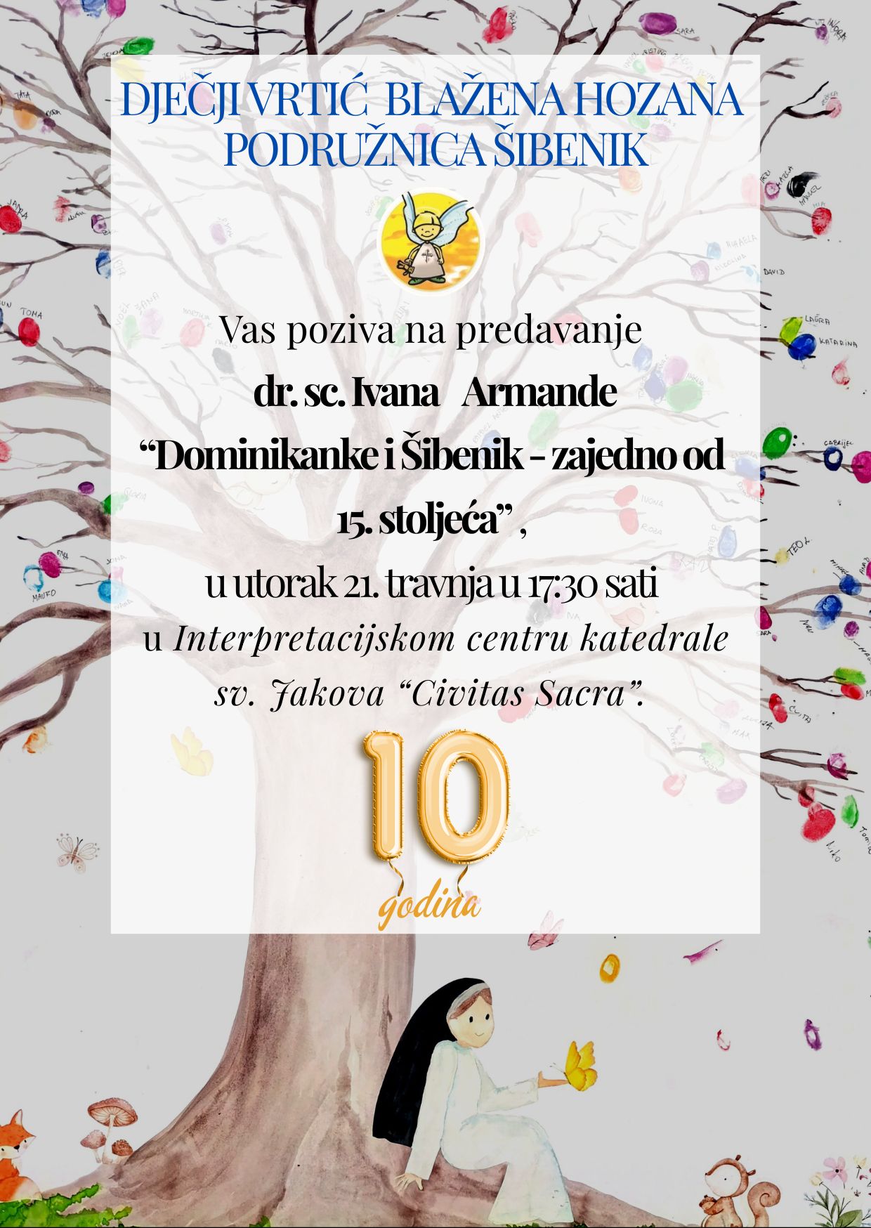 Povodom 10. obljetnice Dječjeg vrtića Blažena Hozana u Šibeniku i Dana vrtića izložba dječjih radova „Blažena Ozana očima djeteta” bit će otvorena u ponedjeljak 20. travnja u 17:15 u Interpretacijskom centru katedrale sv. Jakova „Civitas Sacra“, a prigodno predavanje „Dominikanke i Šibenik – zajedno od 15. stoljeća” održat će u utorak 21. travnja u 17:30 dr. sc. Ivana Armanda.