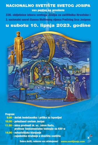 Proslava 336. obljetnice izbora svetoga Josipa za zaštitnika Hrvatske i 3. nacionalni susret članova Molitvenog vijenca Prečistog Srca Josipa održat će se u subotu 10. lipnja u Nacionalnom svetištu sv. Josipa u Karlovcu.