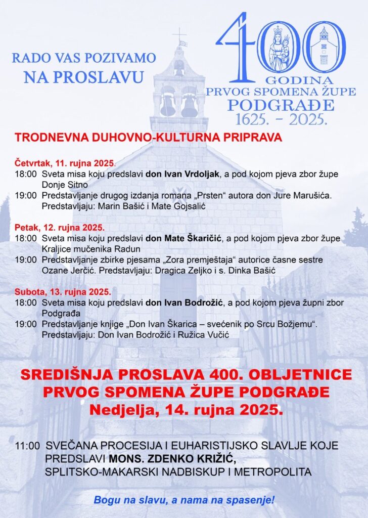 Župa Podgrađe u omiškom zaleđu, a Poljičkom dekanatu, od 11. do 14. rujna, proslavlja 400. obljetnicu prvog spomena.
