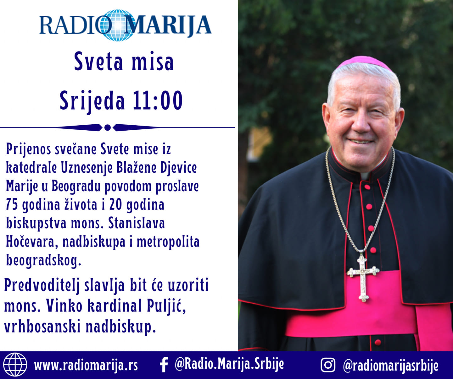 Beograd, (IKA) – Beogradski nadbiskup i metropolit Stanislav Hočevar, u srijedu 11. studenoga, svečanim euharistijskim slavljem u 11 sati, u katedrali Uznesenja Blažene Djevice Marije u Beogradu, Hadži Milentijeva 75, proslavit će 75 godina života i 20 godina biskupskog djelovanja u Beogradu.