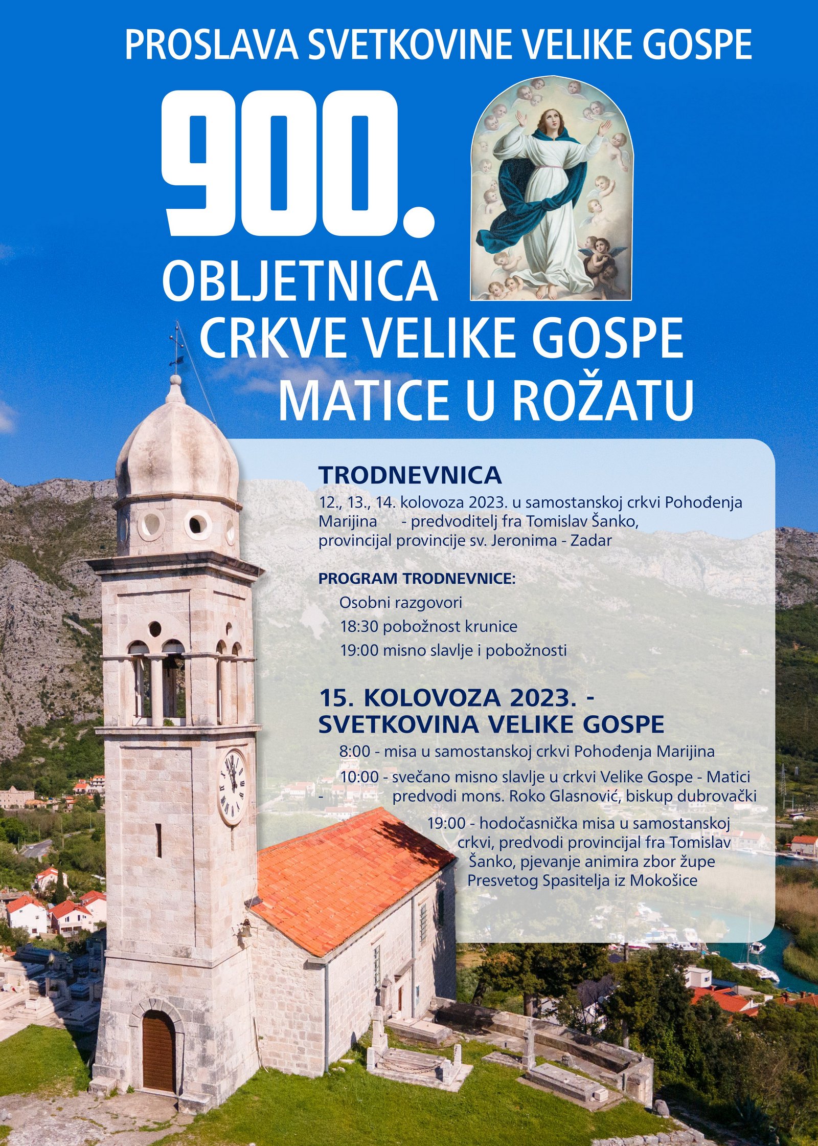 Župa Velike Gospe u Rožatu na svetkovinu svoje nebeske zaštitnice 15. kolovoza proslavlja i 900. obljetnicu prvog pisanog spomena župne crkve Velike Gospe (Matice) u Rožatu. Središnje svečano euharistijsko slavlje u 10 sati u župnoj crkvi smještenoj na brdu iznad Rožata predvodit će dubrovački biskup mons. Roko Glasnović.