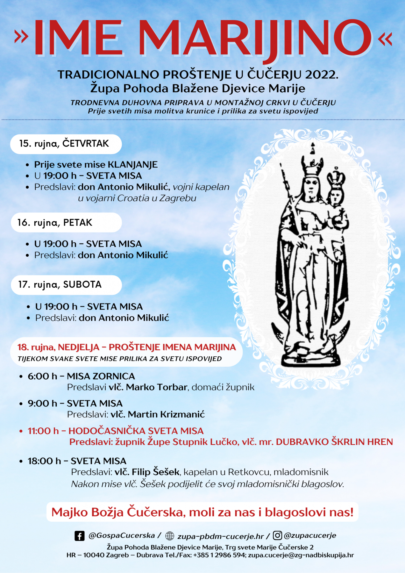 Tradicionalno proštenje, proslava blagdana Imena Marijina bit će u nedjelju 18. rujna u Čučerju. Središnjoj proslavi predhodit će trodnevna duhovna priprava u montažnoj crkvi u Čučerju.