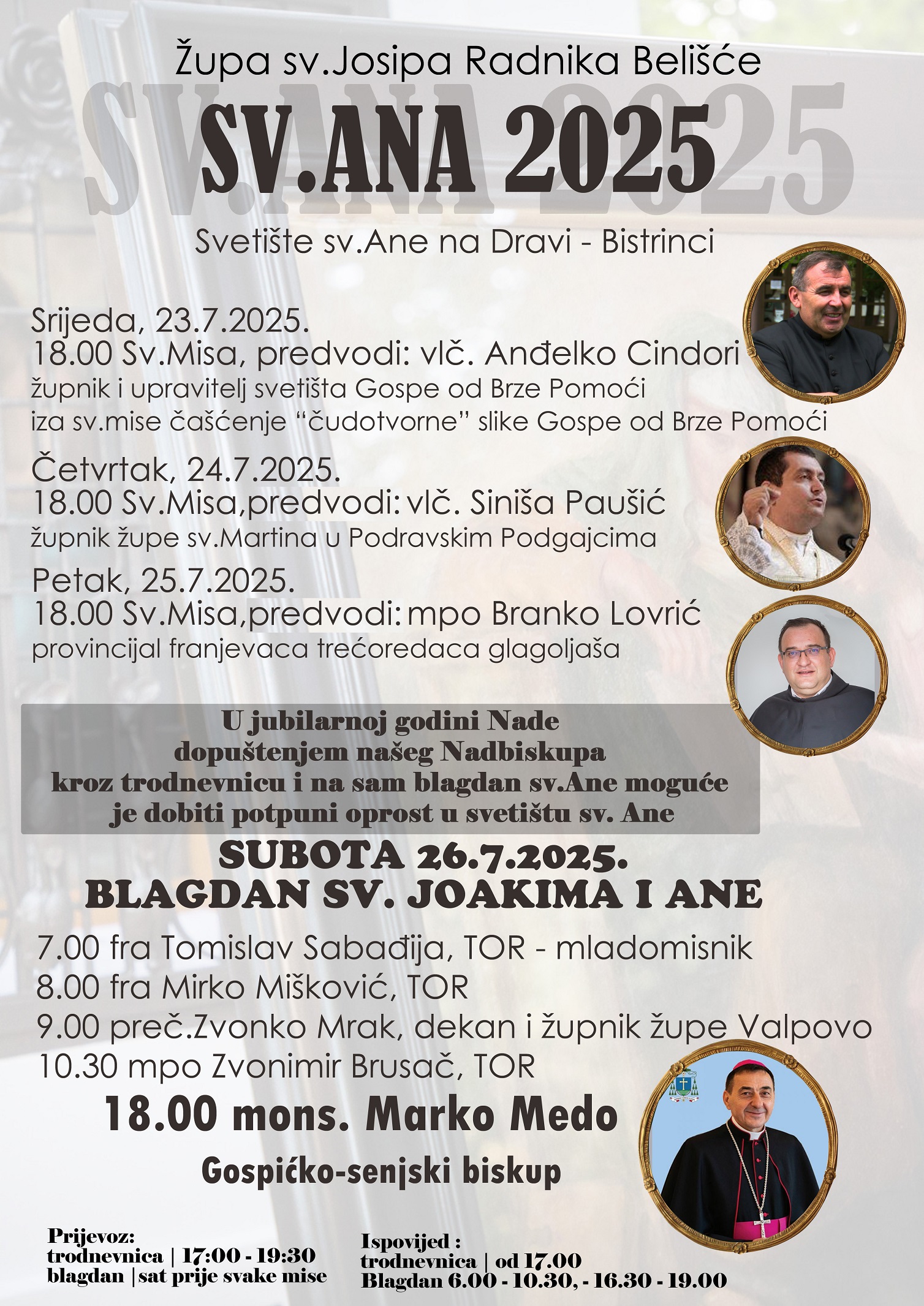 U Svetištu svete Ane na Dravi u naselju Bistrinci u Belišću u subotu, 26. srpnja svečano se slavi blagdan sv. Joakima i Ane. Svečanu misu u 18 sati predvodi gospićko-senjski biskup Marko Medo. Mise na blagdan su još u 7, 8, 9 i 10.30 sati.