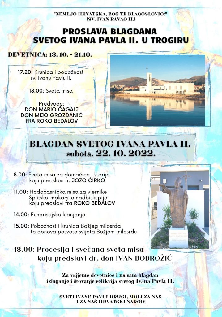Trogir, (IKA) – Blagdan sv. Ivana Pavla II. svečano će biti proslavljen u subotu 22. listopada u crkvi Sv. Ivana Pavla II. u Župi Gospe od Anđela u Trogiru.