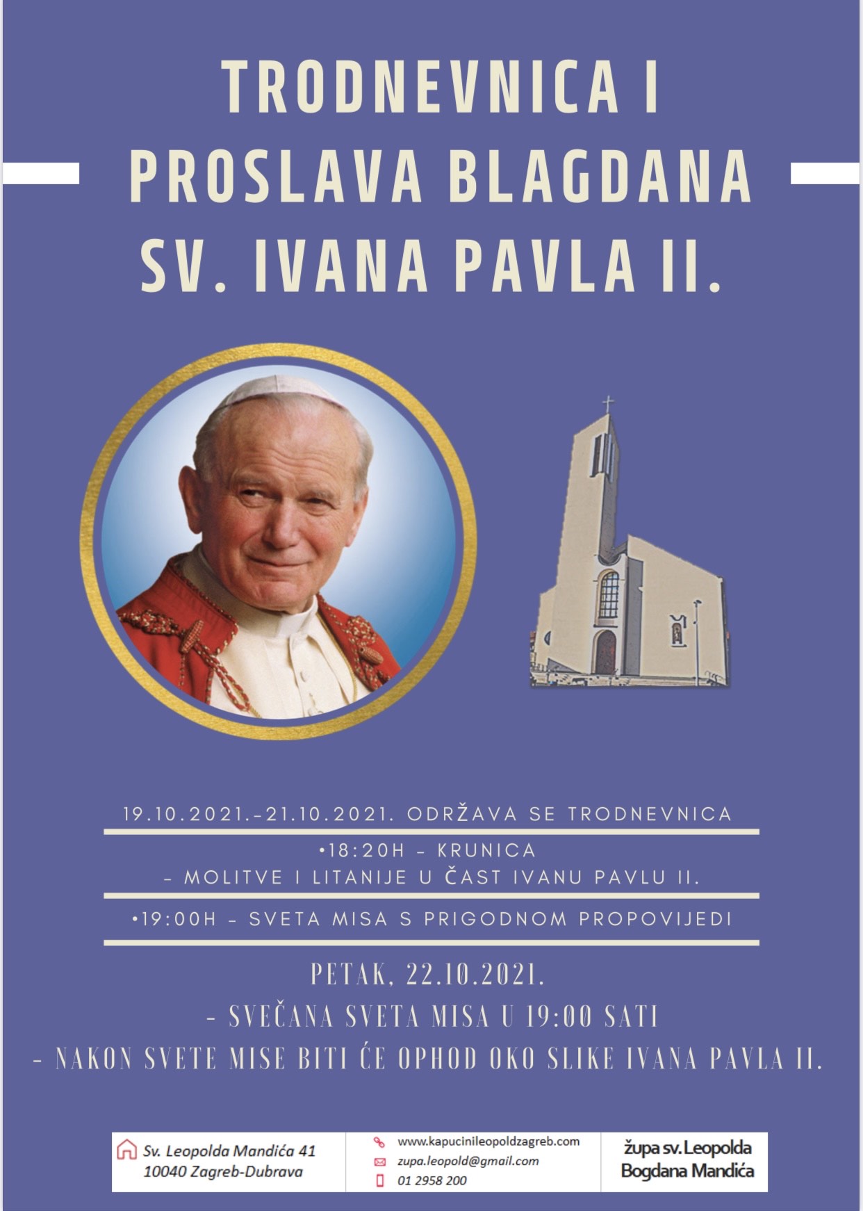 Proslavi blagdana Ivana Pavla II. u Župi sv. Leopolda Bogdana Mandića u zagrebačkoj Dubravi prethodi trodnevnica od 19. do 21. listopada. Pobožnosti u čast Ivana Pavla II. počinju u 18.20 sati a misa je s početkom u 19 sati. Svakoga dana će biti ophod i čašćenje slike i relikvije sv. Ivana Pavla II.