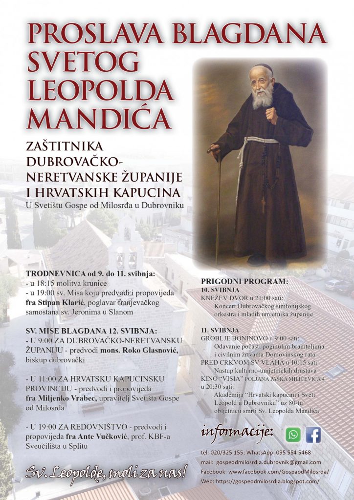 Dubrovnik, (IKA) – Proslava blagdana i 80. obljetnice smrti sv. Leopolda Bogdana Mandića, zaštitnika Dubrovačko-neretvanske županije i Hrvatske kapucinske provincije bit će posebno svečana u Biskupijskom svetištu Gospe od Milosrđa u Dubrovniku gdje će biti bogat duhovni program, a u Gradu će biti održan niz kulturnih događaja.