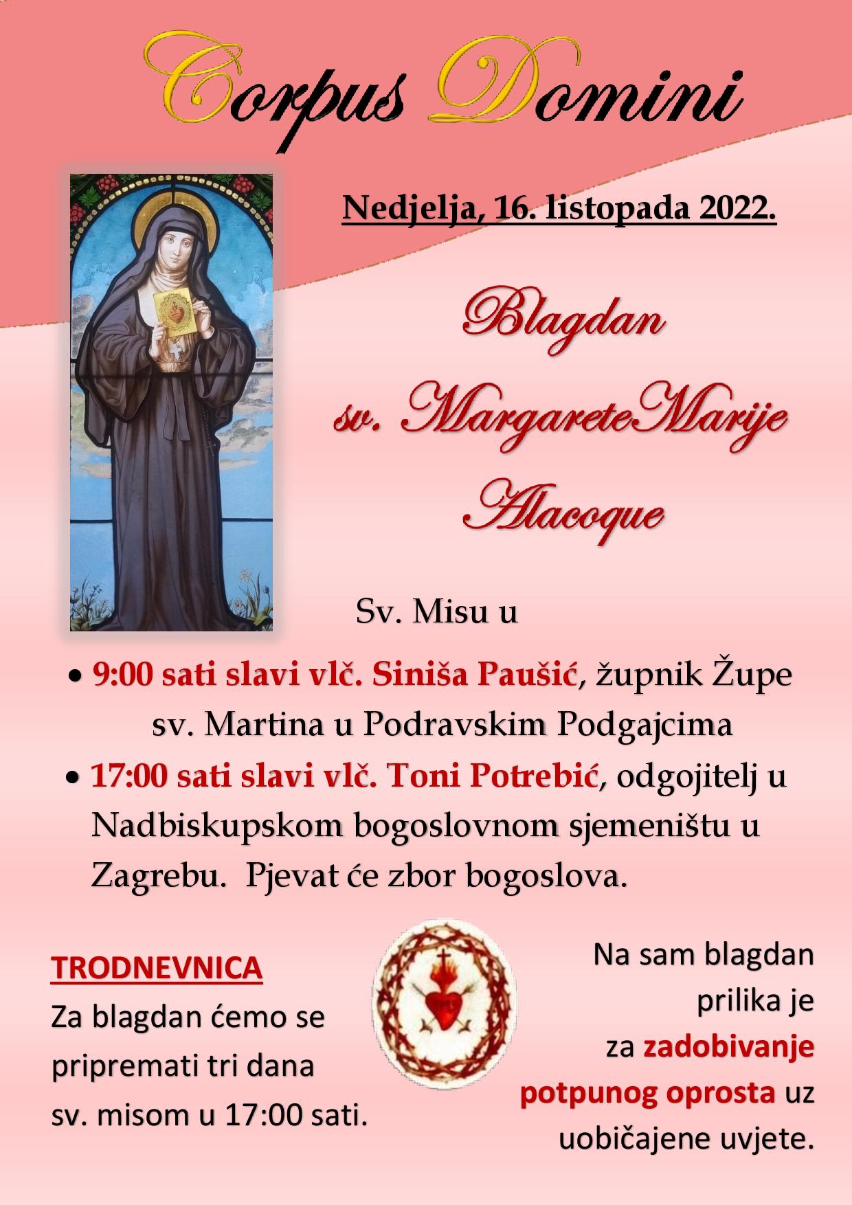 Proslava blagdana sv. Margarete Marije Alacoque u crkvi Corpus Domini Ispis Zagreb (IKA) 16.10.2022. / 09:00 Podijeli članak