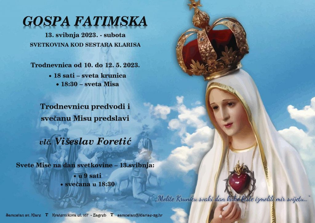 Zagreb, (IKA) – Kod klarisa u Mikulićima, u subotu, 13. svibnja svečano će biti proslavljena svetkovina Gospe Fatimske.