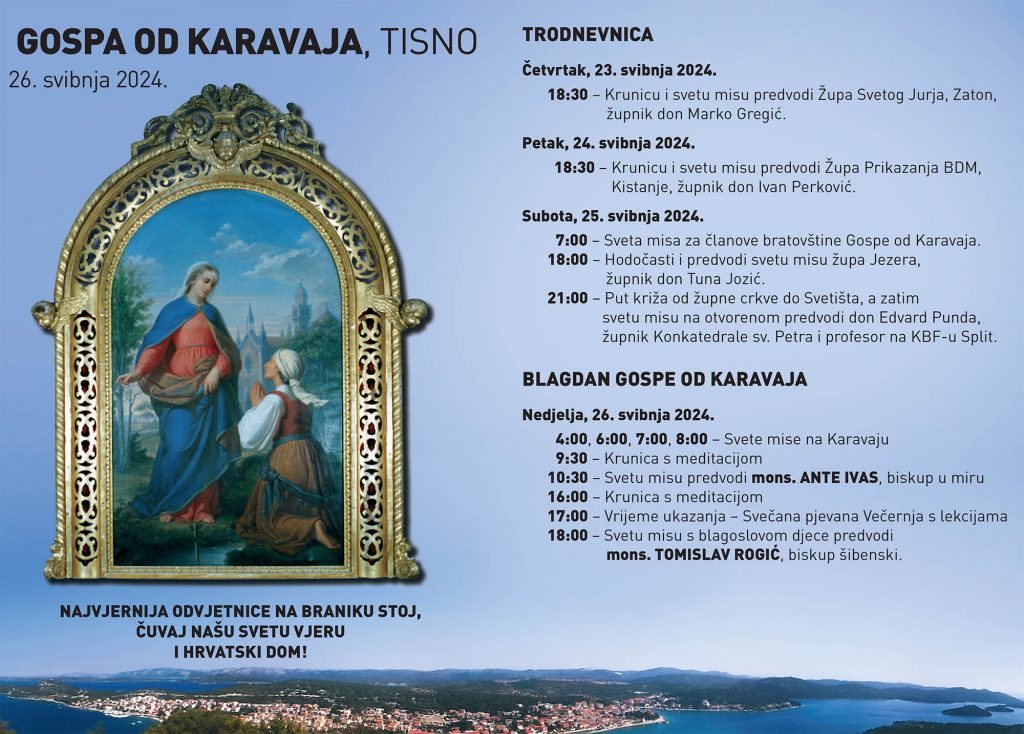 Blagdan Gospe od Karavaja proslavit će se u nedjelju 26. svibnja 2024. u svetištu Gospe od Karavaja u župi Tisno. Misu u 10:30 predvodit će umirovljeni šibenski biskup Ante Ivas. Na misi u 18 sati koju će slaviti šibenski biskup Tomislav Rogić bit će blagoslov djece.