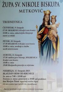 Molitveni program  trodnevnice od četvrtka 9. listopada svaku večer počinje u  17.30 a sv. misa je u 18 sati.