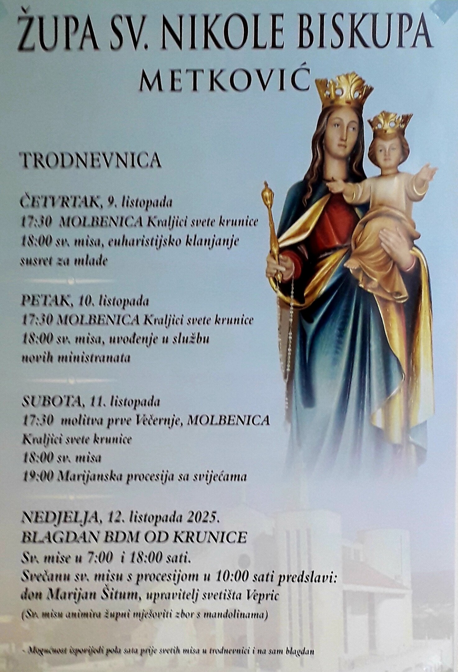 Molitveni program  trodnevnice od četvrtka 9. listopada svaku večer počinje u  17.30 a sv. misa je u 18 sati.