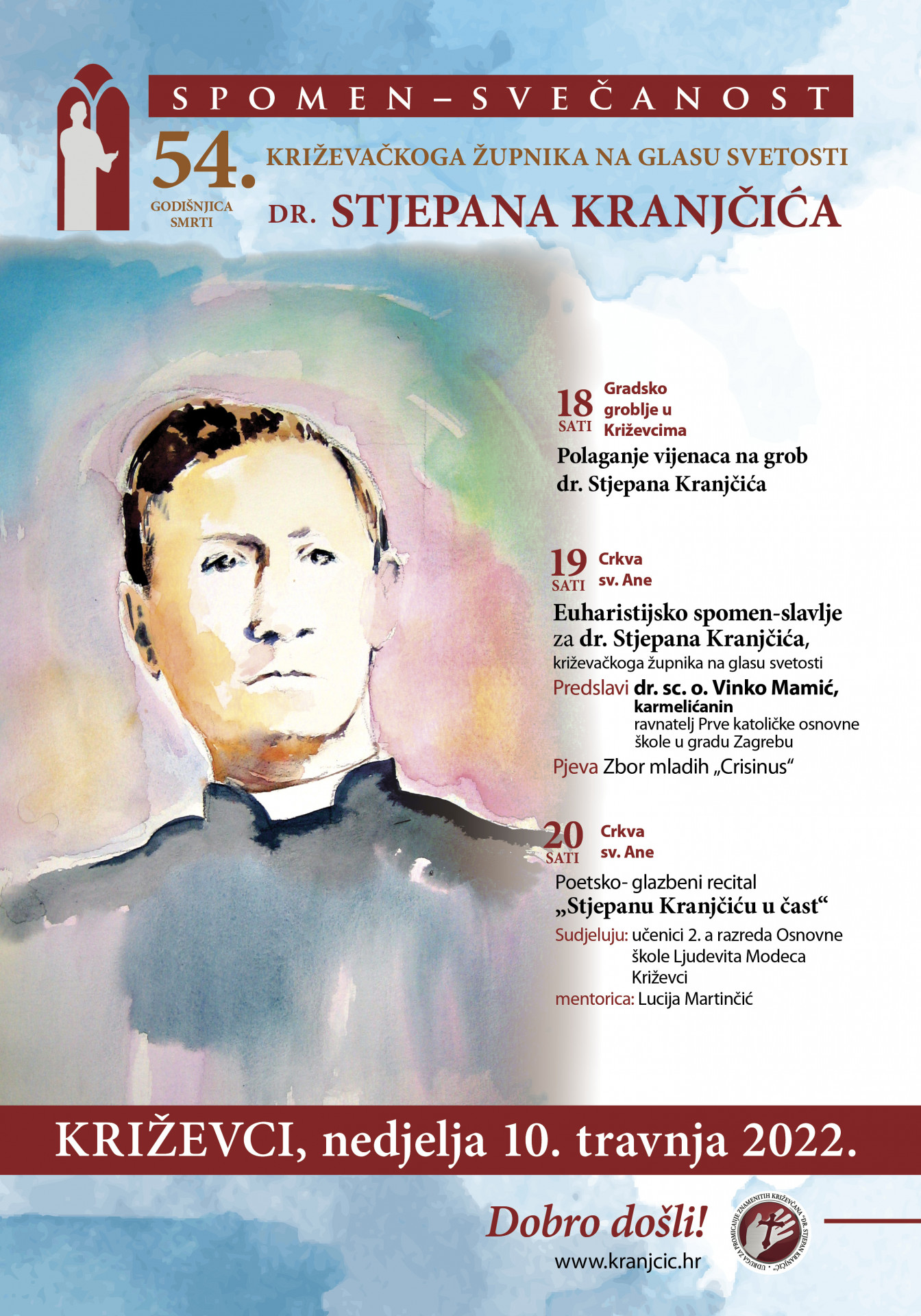 U Križevcima će na Cvjetnicu u nedjelju 10. travnja biti održana spomen-svečanost 54. godišnjice smrti križevačkoga župnika na glasu svetosti Stjepana Kranjčića (Petrijanec, 5. 12. 1918. – Rim, 10. 4. 1968.).