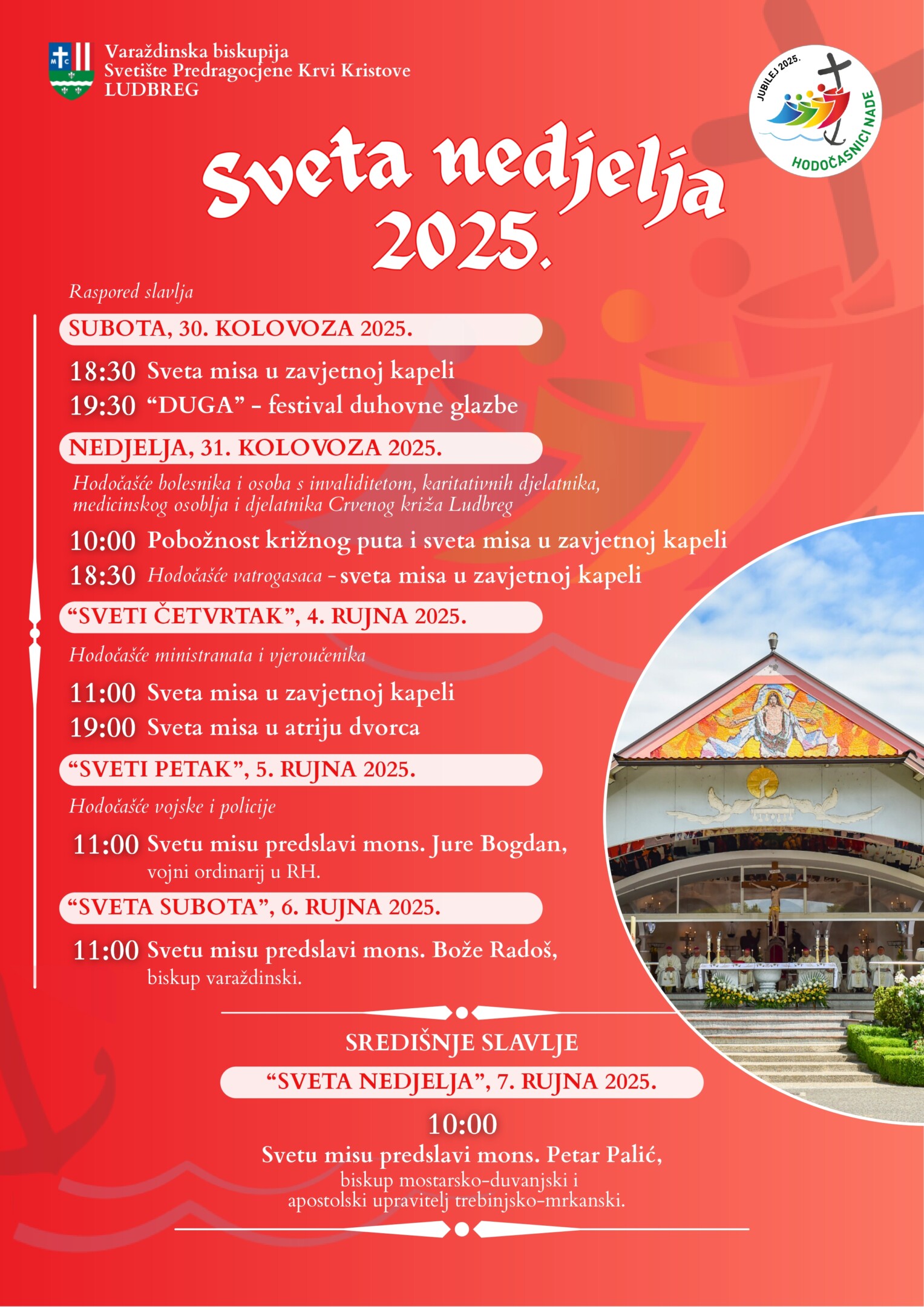 Dani Svete nedjelje u Ludbregu započet će Festivalom duhovne glazbe „Duga“ u subotu 30. kolovoza i trajati do Svete nedjelje 7. rujna kada će središnje euharistijsko slavlje predvoditi mostarsko-duvanjski biskup i trebinjsko-mrkanski apostolski upravitelj Petar Palić.