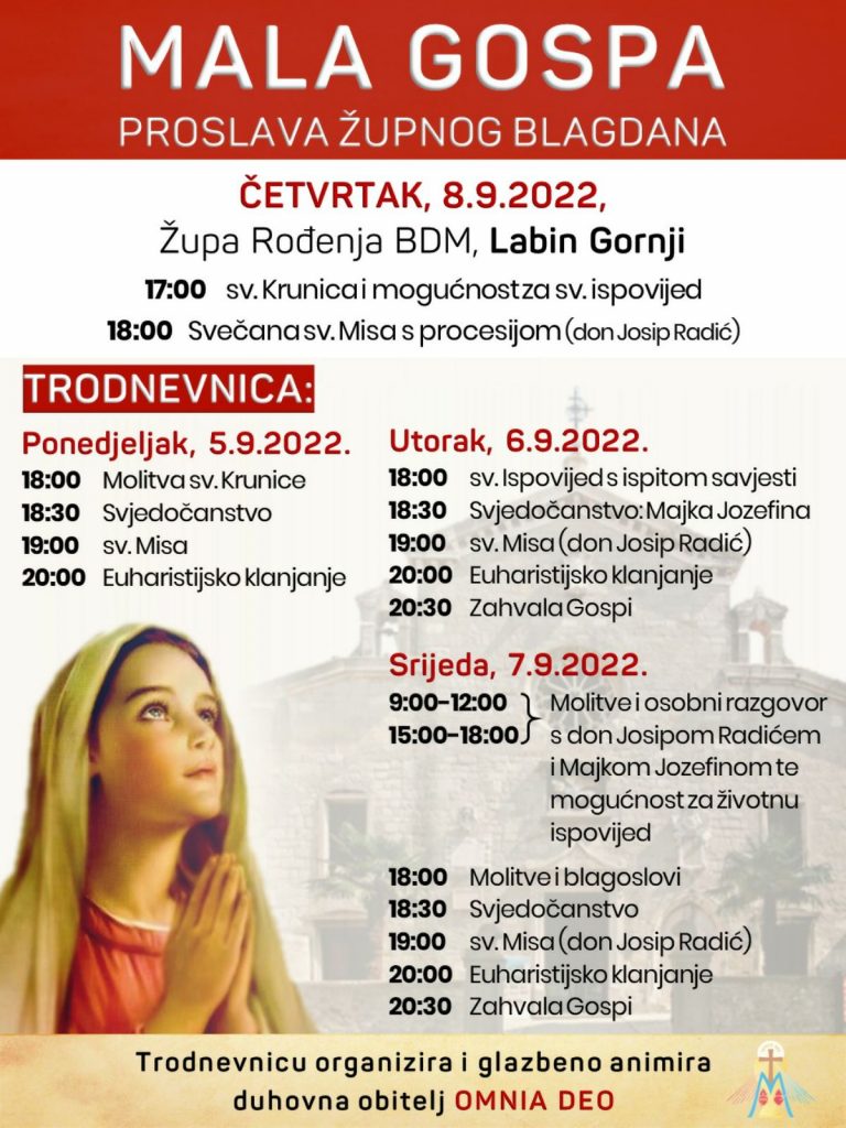 Labin Gornji, (IKA) – Župa Rođenja BDM u Labinu Gornjem proslavit će u četvrtak 8. rujna svetkovinu župne zaštitnice misom koju će u 18 sati predvoditi don Josip Radić.