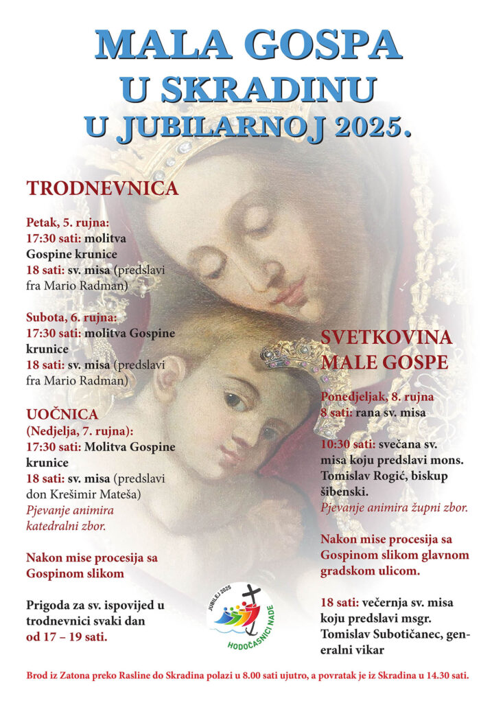 Župa Rođenja Blažene Djevice Marije u Skradinu proslavit će svetkovinu nebeske zaštitnice u ponedjeljak 8. rujna. Svečanu misu u 10.30 predvodit će šibenski biskup Tomislav Rogić. Slijedi procesija s Gospinom slikom glavnom gradskom ulicom. Večernju misu slavit će generalni vikar mons. Tomislav Subotičanec. Jutarnja misa bit će u 8 sati.