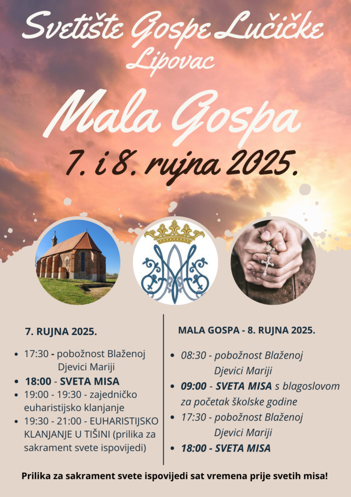 Blagdan Male Gospe svečano će se proslaviti u Svetištu Gospe Lučičke u župi Lipovac. Program počinje u nedjelju, 7. rujna, pobožnošću Blaženoj Djevici Mariji u 17:30, nakon čega će u 18 sati biti slavljena misa. Od 19 do 19:30 predviđeno je zajedničko euharistijsko klanjanje, a od 19:30 do 21 sat euharistijsko klanjanje u tišini, uz priliku za sakrament ispovijedi.
