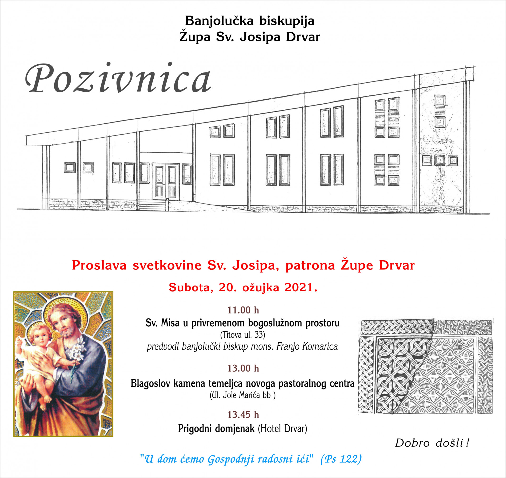 Svetu misu u 11 sati u privremenom bogoslužnom prostoru (Titova ul. 33) predslavit će banjolučki biskup Franjo Komarica, nakon čega će biti svečanost blagoslova temeljnog kamena za novi pastoralni centar, na lokaciji u Ulici Jole Marića bb, za što je župa Drvar nedavno dobila građevinsku dozvolu.
