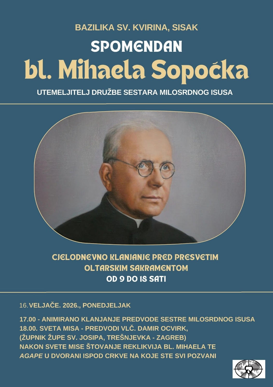 Proslava spomendana bl. Mihaela Sopoćka u Sisku Ispis Sisak (IKA) 16.02.2026. / 09:00 Proslava spomendana bl. Mihaela Sopoćka u bazilici sv. Kvirina u Sisku bit će u ponedjeljak 16. veljače. Misu u 18 sati predvodi vlč. Damir Ocvirk. Podijeli članak