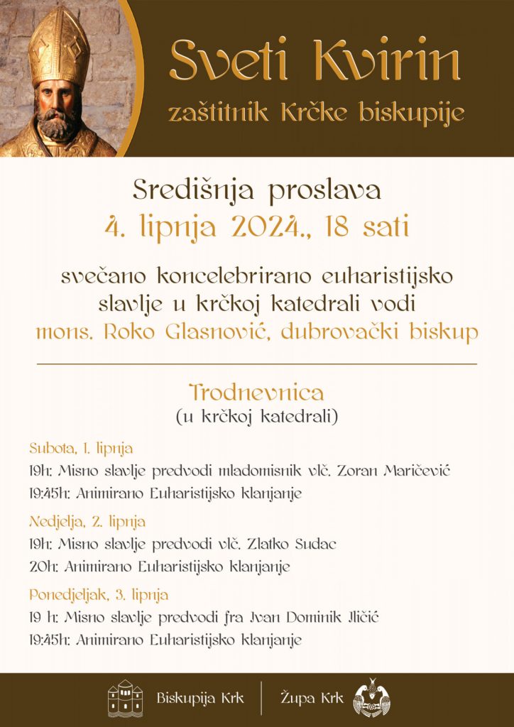 Euharistijsko slavlje na blagdan zaštitnika Krčke biskupije sv. Kvirina, u utorak 4. lipnja 2024., predvodit će u krčkoj katedrali u 18 sati dubrovački biskup Roko Glasnović.