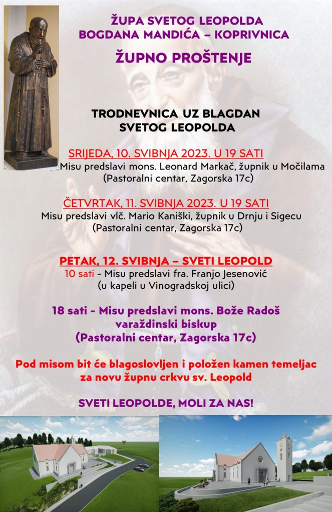 Župa sv. Leopolda Bogdana Mandića svečano će proslaviti blagdan svoga zaštitnika u petak 12. svibnja. Misu u 18 sati predslavit će varaždinski biskup Bože Radoš u Pastoralnom centru. Tijekom mise bit će blagoslovljen i položen kamen temeljac za novu župnu crkvu sv. Leopolda. Istoga dana u 10 sati misu će predslaviti fra Franjo Jesenović u kapeli u Vinogradskoj ulici.