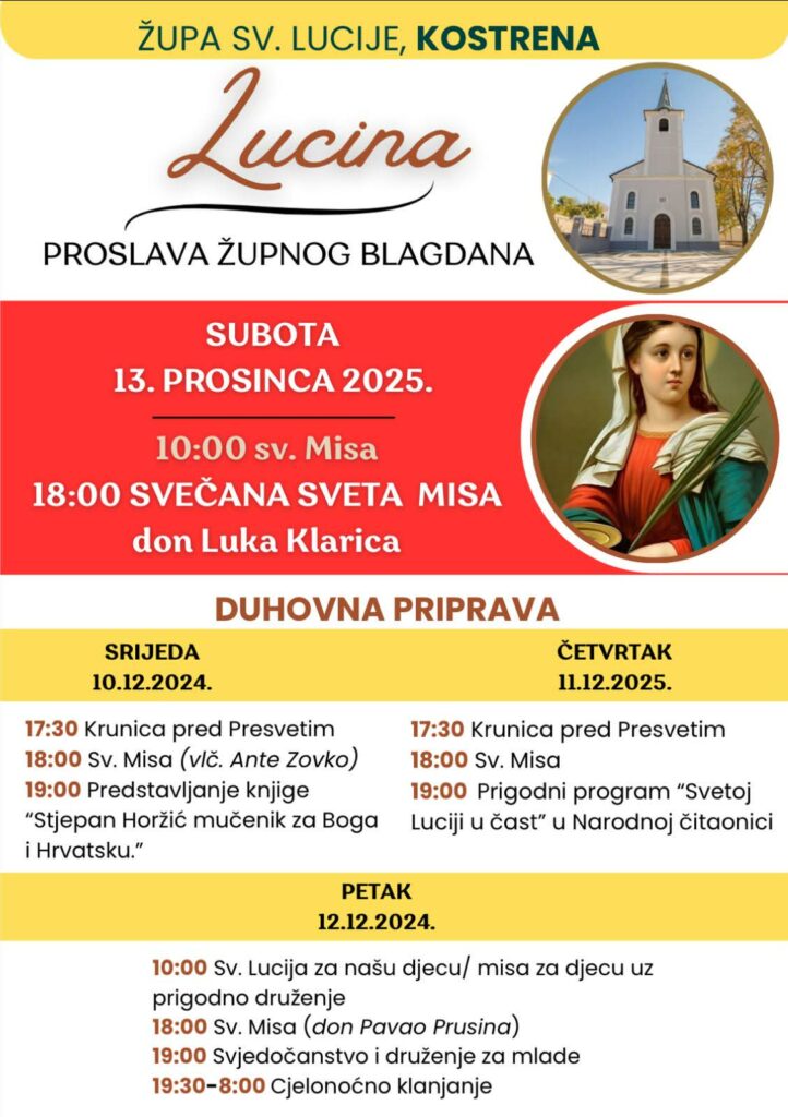 U četvrtak 11. prosinca nakon molitve krunice u 17.30, slavit će se misa u 18 sati. U 19 sati u Narodnoj čitaonici u Kostreni bit će održan prigodan program „Svetoj Luciji u čast“.